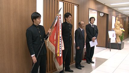 全国高校サッカー選手権大会岩手県大会決勝で盛岡商業高校に勝って3年ぶり23回目の優勝を果たした遠野高校サッカー部が、きのう(7日)、市長室を訪れ、優勝の報告をしました。遠野高校サッカー部は、今週3日・日曜日に盛岡南公園球技場で行われた県大会決勝で、盛岡商業高校を2対1で下し3年ぶり23回目の優勝を果たし、新人戦と県高校総体に続いて主要大会3冠を達成しました。きのう、優勝報告のためとぴあ庁舎を訪れたのは、遠野高校の桐田千秋校長、長谷川仁監督、伊藤仁也副主将、菊池和樹副主将の4人です。初めに桐田校長から本田市長などに大会の結果が報告されると、続いて、長谷川監督が大会の様子や優勝の要因について話し、最後に伊藤副主将と菊池副主将が全国大会への抱負を話しました。報告を受けた本田市長は「全国では、どんな相手でも堂々と戦って遠高魂を存分に発揮し、1つ2つと勝ち上がることを期待しています」と激励しました。全国高校サッカー選手権全国大会は、来月30日に開会式が行われ、全国から集まる代表校が優勝を目指し、熱い戦いを繰り広げます。