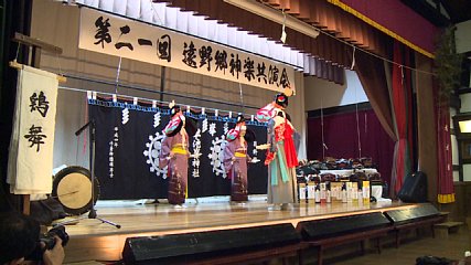 市内の神楽保存会の共演が楽しめる遠野郷神楽共演会が26日日曜日にたかむろ水光園で開かれました。ことしの共演会には、市内の神楽保存会12団体が出演し、全部で16の演目を披露しました。神楽共演会は、担い手を育てながら舞の保存と伝承を目指していて、新たに習得した舞をお披露目する場にもなっています。各団体の演目は、舞台の初めに演じられる鶏舞から五穀豊穣や災いを払う舞などさまざまで、そのうち湧水神楽の膳舞がこの日一番の注目を集めていました。膳舞は、盆を手のひらに乗せたまま落とさずに激しく踊る舞です。舞い手は達曽部小学校5年の佐々木脩泰君で、半年間、稽古を積んだという舞に詰めかけた観客から拍手喝采をあびていました。ことしは、新たな舞い手が出演する保存会が多く、互いの活躍と上達を誓い合っていました。遠野郷神楽共演会の模様は、3月の放送予定となっています。