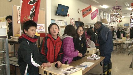 上郷小学校の5年生の児童が先週土曜日(15日)、夢産直かみごうで販売体験をしました。この体験は、販売を通して幅広い年齢層の人たちとコミュニケーションを深めるとともに売り上げ金を東日本大震災の復興と発展途上国の支援に役立てようとおととしから行われています。この日は、上郷小学校の5年生が去年、田植えから稲刈りまでを行った「ヒメノモチ」を使った「切りもち」と「紅白もち」あわせて180個を販売しました。児童たちは、自分たちが育てたもち米でできた「切りもち」と「紅白もち」を買ってもらおうと手作りのポスターを手に「いらっしゃいませ」と大きな声を出してお客さんを呼び止めていました。なお、この日の売り上げとして1万8000円が被災地を援助している団体などに来月寄付されるということです。