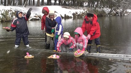 「流しびな」は、子どもたちに地域に伝わる伝統行事を体験してもらおうと遠野市社会福祉協議会附馬牛支部が行いました。きのうは、附馬牛保育園の園児や地域の人たちおよそ20人が集まり、園児たちのひなまつりに関する歌のあと近くの川に向かいました。園児たちは、それぞれの願いを込めながら折り紙で作ったひな人形を川に流していました。