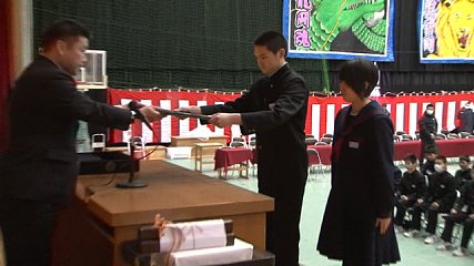 親切な行為が社会にあたたかな心の輪を広げたとして、きのう(11日・火曜日)、社団法人「小さな親切」運動本部から遠野中学校に実行章が贈られました。「小さな親切」実行章は、自分たちにできることで社会貢献をしている個人や団体に対し贈られるものです。遠野中学校では、去年、遠野まごころネットの多田一彦理事長の講演を聞き感動した生徒たちが、自主的にボランティア活動を行い、花火大会後の清掃活動の謝礼金や文化祭などでの募金活動の益金全額を遠野まごごろネットに寄付しました。その取り組みを知った「小さな親切」運動の岩手県本部が運動本部に推薦し、今回、実行章が贈られました。きのうの贈呈式では、事務局をつとめる岩手銀行遠野支店の千葉健司支店長から遠野中学校3年の鈴木凌前生徒会長と吉田斐前JRC委員長に実行章が手渡されました。この後、鈴木前生徒会長がお礼の言葉を述べました。なお、遠野中学校では、今後も募金活動のほかにも被災地を訪問してのボランティア活動など積極的に取り組んでいくということです。