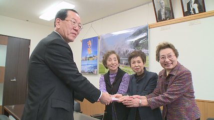 先月までとおの昔話いろり火の会として活動をしてきた3人の語り部が今週7日(月曜日)、とぴあ庁舎を訪れ、全国語り部フェスティバルで実行委員会や入場者から遠野市に寄せられた義援金を本田市長に手渡しました。この日、とぴあ庁舎を訪れたのは、旧いろり火の会の工藤さのみさん、奥寺恭子さん、内田芳子さんの3人です。旧いろり火の会のメンバーが出演した「海の京都全国語り部フェスティバル」は、先月、全国で初めて京都で開催されました。今回の出演は、工藤さんの京都の語り部仲間がフェスティバルの主催者に紹介したことがきっかけとなり招待されたもので、奥寺さんと内田さんが出演し、「ザシキワラシ」や「オシラサマ」の昔話を披露しました。また、当日会場では、主催者である丹後観光口コミ大使語り部の会が東日本大震災災害義援金を募り、入場者と主催者からの義援金4万6096円を工藤さんのもとに送り後方支援に取り組む遠野市に届けてほしいと託されたということです。工藤さんから義援金を受け取った本田市長は、心暖まる京都からの支援に感謝し、継続した後方支援に活用させていただきますと話していました。旧いろり火の会から新たな語り部団体として今月から活動を始めた「遠野昔話語り部の会」の事務局を務める工藤さんは、遠野の語り部文化を通して京都をはじめ、全国の人たちとの縁を大切にしていきたいと話していました。