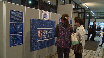ことし6月のサッカーワールドカップに出場する日本代表選手に贈られる応援メッセージがきのう(28日・月曜日)、市民センターホワイエで披露されました。こちらが市民から寄せられた応援メッセージが書かれたメッセージフラッグです。メッセージは、サッカー日本代表選手へ遠野市からも応援を届けようと今月上旬に市民センター2階の事務室前で受け付けられていました。フラッグには、中高生を中心に所狭しと応援メッセージが書かれています。きのうは、市民センターで開催された「狂言風オペラ2014ドン・ジョバンニ」の公演に合わせ、寄せられたメッセージフラッグが披露されました。市民から寄せられたメッセージフラッグは、日本サッカー協会を通し来月25日に予定されている壮行会で選手たちに贈られるということです。