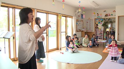 松崎町にある「子育て支援センターまなざし」では毎月、親子で楽しめるまなざし音楽会が開かれています。子育て中の親子が遊んだり、交流したり、育児相談の場として利用できるのが子育て支援センターまなざしです。毎月第3火曜日は、まなざし音楽会が開かれることになっていて、今月はきょうが音楽会の日です。演奏してくれるのは、市内を拠点に音楽活動をしている新田ちよさんと伊禮しおりさんです。<<ON>>きょうは、17組の親子が音楽会に参加して一緒に歌を歌ったり、タンバリンや鈴を鳴らしたりして思い思いに音楽を楽しみました。子育て支援センターまなざしでは、音楽会のほかに乳児限定で遊べる赤ちゃんDayやお楽しみの日を毎月設けており、ことしも市内11カ所にある子育てサークルと合同でイベントを開き、子育ての輪を広げるきっかけづくりを行うことにしているということです。