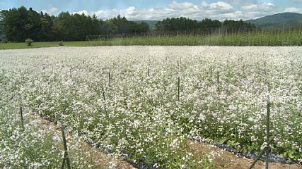 青笹町の畑では、ダイコンの花が見頃を迎えています。青空のもと咲き誇る白くて花びらの先端が紫色の可憐なダイコンの花。青笹町の佐々木新夫さんが3月中旬にまいたダイコンの種が成長し今月上旬から花が咲き始めました。佐々木さんは、ダイコンの種を採取するため3年前から50アールの畑にダイコンを植えています。種を採取する作業はこのあと8月に行うということです。佐々木さんによりますと、このダイコンの花は、今月いっぱい楽しめそうだということです。