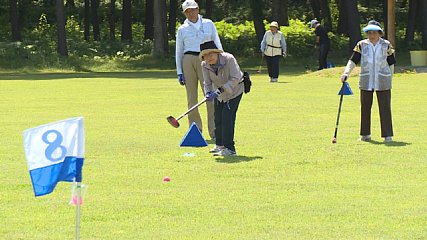 県内南沿岸地域のグラウンド・ゴルフ愛好家が集う会員交流グラウンド・ゴルフ大会がきのう(8日・火曜日)遠野運動公園で開かれました。この大会は、参加者の健康維持と交流を深めようと、岩手県グラウンド・ゴルフ協会が年に2回開催していて、会場は南沿岸ブロックの市と町で持ち回りで開かれています。夏の日差しが照りつける会場には、遠野市をはじめ住田町や大船渡市、さらに今大会から釜石市と大槌町が加わり、合わせて7つのグラウンド・ゴルフ協会から294人が参加しました。開会式では岩手県グラウンド・ゴルフ協会の畑中秀一副会長や、遠野市グラウンド・ゴルフ協会の谷口徹太郎会長があいさつし、参加者を激励しました。そして選手を代表して遠野町の佐々木秀喜さんが選手宣誓を行いました。競技は、前半と後半に分けて行われました。日ごろ、それぞれの地域でグラウンド・ゴルフを楽しむ人たちが一緒にコースを回り互いに声を掛け合いながらさわやかな汗を流していました。参加者同士の交流を目的とした大会ですが、コース上では、笑いもあればホールポストを狙い真剣な眼差しでボールを打つ姿などが見られました。なお、大会の結果、男子の部で遠野市から参加した菊池英雄さんが見事・優勝したほか、同じく遠野市から参加した菊池寛さんが2位となりました。