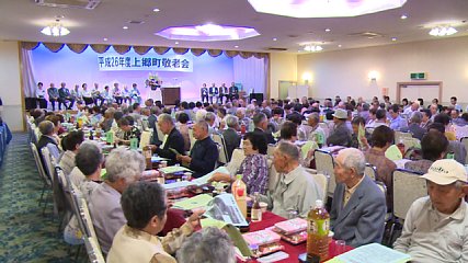 続いては先週5日に開かれた上郷町の敬老会です。上郷町の敬老会には対象となる75歳以上の敬老者697人のうち268人が出席しました。敬老会では、卒寿と米寿、それに喜寿を迎えた人たちに遠野市や社会福祉協議会の上郷支部から記念品が贈られ、長寿者を代表して大洞幸子さんが謝辞を述べました。またこの日、会場では、SLの復活をきっかけに上郷町の有志のD50賛歌復活委員会がよみがえらせた「じゃじゃぽっぽ」と「上郷音頭」の懐かしいメロディーが披露されました。敬老会で発表された長寿番付によりますと上郷町は101歳を最高に上位10人はいずれも女性となっています。続いて松崎町の敬老会です。松崎町の敬老会では、75歳以上のお年寄り合わせて739人が対象で最高齢は、104歳です。このうち、卒寿、米寿、喜寿を迎えたお年寄りは、合わせて99人です。今週6日に開かれた松崎町の敬老会には、およそ270人が出席しました。敬老会では初めに遠野市と遠野市社会福祉協議会松崎支部から卒寿と米寿、喜寿を迎えたお年寄りに記念品が贈られました。この後来賓からの祝辞に続いて敬老者を代表して菊池健市さんが、お礼のことばを述べました。また、この日は白岩保育園の園児によるよさこいソーランなどのアトラクションも行われました。出席したお年寄りは、園児たちのかわいらしい姿に目を細めるなどしながらステージで繰り広げられるアトラクションを楽しんでいました。