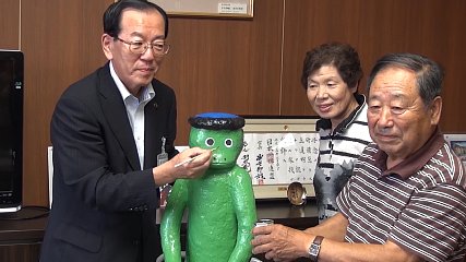 カッパ伝説が残る山形県の庄内町へ遠野生まれのカッパの花子が嫁ぐことになりました。その報告の様子が届きましたのでお伝えします。この縁談は、山形県庄内町に住む「庄内民話の会」の語りべ長南一美さんの呼びかけで実現しました。先週22日には、長南さんが市長室を訪れ、本田市長に結婚の報告をしました。かっぱの花子が嫁入りする庄内町にはカッパの伝説が残っていて、5年前には遠野生まれのカッパの「成子」が庄内町の「平吉」のもとへ嫁いでいます。今回は、その「平吉」と「成子」夫婦の息子「太郎」のもとへ「花子」が嫁ぐことになったということです。市商工観光課によりますと「太郎」と「花子」の結婚披露宴は9月に予定されているということです。