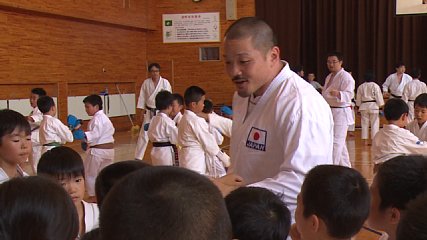 東日本大震災で被災した人たちを継続的に応援している空手家たちによるチャリティプロジェクトが先週2日(土曜日)から2日間の日程で遠野市を会場に行われました。「SayOss!プロジェクト」と題したこのセミナーは、空手の流派・会派の枠を超え東日本大震災の復興支援の一助となることを目的に行われ、遠野市での開催は3回目となります。今回は、遠野をはじめ盛岡や釜石などの小学1年生から中学3年生までおよそ80人の空手道の選手が集まり、稽古に汗を流しました。このセミナーで選手たちに指導をしていた土佐樹誉彦さんは、世界大会をはじめ数々の国内外の大会で活躍をし、現在は、埼玉を拠点に世界で空手道を指導しています。土佐さんは、埼玉県出身ですが、高校時代、岩手で過ごし、また、その後の国民体育大会では、岩手の代表として出場したこともあり、岩手は第二のふるさとと言います。自分を育ててくれた岩手に恩返しをという思いで土佐さんは、遠野を訪れています。今回のセミナーで土佐さんは、空手の技のみならず、あいさつの大切さなど人としての礼儀についても選手たちに熱心に指導していました。汗が止まらないような暑さの中でしたが、選手たちは、土佐さんをはじめ多くの指導者の話を集中して聞き、また、ほかの道場の選手と技を交えながらレベルアップに努めていました。