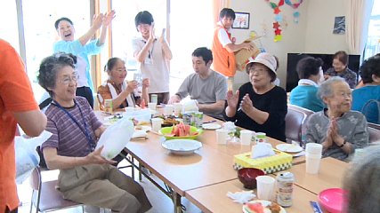穀町にある仮設住宅希望の郷「絆」でおととい(24日・日曜日)地域の人と仮設入居者の皆さんが食事やゲームなどで楽しい時間を過ごしました。ゆく夏を惜しみ楽しいひとときを過ごそうと遠野町3区自治会が希望の郷「絆」サポートセンターの協力を得ながら赤い羽根災害ボランティアNPO活動募金「住民支え合い活動助成」を受けて開きました。この日は、日頃から仮設住宅に入居している皆さんと触れ合い活動をしている遠野町3区自治会の山本順一会長や、婦人会のメンバーが訪れました。野外で流しそうめんを楽しんだ後、集会所に移動した参加者たちは、遠野町3区の婦人会が用意したご自慢の漬け物やおにぎりなどを食べながら会話を弾ませ、そして、ビンゴゲームや輪投げで盛り上がっていました。「希望の郷」に入居している皆さんは、普段から遠野町3区の婦人会の皆さんと交流を深めていることもあり、終始、笑い声が絶えない和やかな雰囲気の中で楽しいひとときを過ごしていました。希望の郷「絆」は現在、設置している40戸のうち入居している戸数が28戸にまで減少していることから、サポートセンターでは今後も入居者の皆さんと地域の人たちとのふれあい活動を進めていきたいと話しています。