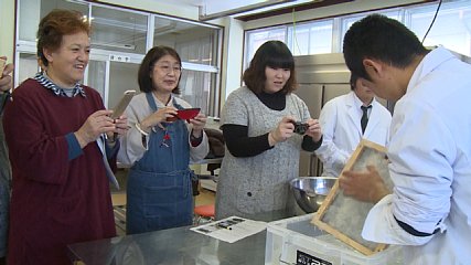 緑峰高校草花研究班が研究してきたホップ和紙を広く市民に広げようと、先週金曜日(19日・金曜日)にホップ和紙講習会が開かれました。このホップ和紙講習会は、農業振興などに取り組む市民講座である「遠野ふるさとあぐりスクール」として遠野市農家支援室・アストが開き、遠野ホップ農協婦人部のメンバーや和紙に興味を持っている市民など16人が参加しました。講師は、緑峰高校草花研究班の村上利行先生と生徒たちが務めました。講習会では、初めに生徒たちがホップ和紙ができるまでの一連の流れを紹介しました。廃棄されるホップのつるからきれいな和紙ができる様子を目の当たりにした参加者たちは、生徒たちの取り組みに改めて感心し、メモをとり質問するなど、積極的に取り組んでいました。生徒たちの説明のあとは、いよいよ和紙作りに挑戦です。今回は、ホップの主蔓の皮むきを1時間行い、何グラムとれたかを計量します。目標は20グラムです。A4サイズの和紙1枚を作るには、40グラムの皮が必要ということですが、40グラムの皮をむくには2時間近くかかるそうです。参加者は、生徒たちと話をしながら和気あいあいと作業を行っていました。次回は、今週26日(金曜日)に紙すきを行うまでを体験するということです。