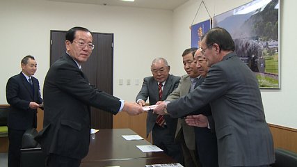 ことし10月に行われたとおの技能まつりでの収益金を産業振興に役立ててほしいと、きのう(25日・木曜日)遠野職業訓練協会が遠野市に寄付しました。きのう(25日・木曜日)とぴあ庁舎を訪れたのは、遠野職業訓練協会の照井文雄会長や、遠野建設組合の及川幸太郎組合長などの4人です。遠野職業訓練協会は、毎年10月に開催されるとおの技能まつりで、職人が訓練生とともに刃物とぎを行なっており、その収益金を6年前から市に寄付しています。今回は、刃物とぎでの収益金のおよそ5万円を産業振興と市の活性化事業に役立ててほしいと、本田市長に目録を手渡しました。目録を受け取った本田市長は「さらに遠野が元気になるように取組みを進めたい」と今回の寄付に感謝していました。
