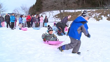遠野児童館できのう(14日・水曜日)、毎年恒例の「雪上運動会」が行われ、子どもたちが寒さを吹き飛ばす熱戦を繰り広げました。この雪上運動会は、運動不足になりがちな冬休みの期間を外に出て元気いっぱいに遊んでもらおうと毎年開催されています。きのうは、児童館に通う遠野小学校の児童41人が参加し、開会式で5年生の千葉遼人君が選手宣誓を行いました。競技は、ソリレースやパン食い競争ならぬお菓子食い競争など4種目で、児童たちは、3チームに分かれて熱戦を繰り広げました。また、広場の雪かきも兼ねた雪運びレースでは、ソリやスコップなどを上手に使ってより高い雪山をつくろうとチーム一丸となって雪を積み上げていました。きのうの市内は、児童たちの元気で寒さも吹き飛んだかのような暖かい日差しに恵まれ、雪国遠野ならではの遊びを満喫し、仲間との交流を深めていました。