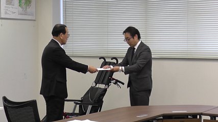 釜石地区法人会が先週(17日・火曜日)、遠野市に車いすを贈りました。その様子が届きましたのでお伝えします。釜石地区法人会は、遠野・釜石・大槌の企業が会員となり、企業経営の向上と地域社会の健全な発展に役立てることを目的にさまざまな事業を行っています。その活動の一つ、地域社会への貢献として先週17日、市に車いすを贈りました。とぴあ庁舎には、釜石地区法人会の角田直樹青年部会長が訪れ、福祉施設などで役立ててくださいと10万円相当の車いす1台を贈りました。受け取った本田市長は「車いすは、障がい者にとって生活の一助となり欠かせない福祉用具です。心から感謝申し上げます」とあいさつしていました。今回贈られた車いすは、松崎町にある老人保健施設とおので活用されるということです。なお、釜石地区法人会は、平成11年度から市に車いすを贈り続け、これまでの寄付は、およそ270万円相当になるということです。