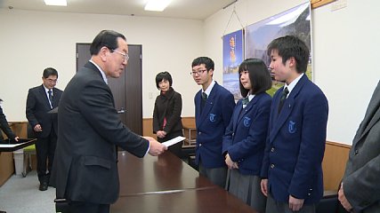 きのう(24日)、緑峰高校の商業クラブがとぴあ庁舎を訪れ、復興支援活動に役立ててほしいと3万5000円を遠野市に寄付しました。今回、遠野市に贈られた寄付金は、緑峰高校情報処理科の2年生が去年10月に企画したチャレンジショップと商業クラブの文化祭での収益の一部を充てたものです。寄付金の贈呈には、商業クラブの生徒を代表し情報処理科2年で商業クラブ会長の佐々木心さんなどが訪れ、本田市長に目録を手渡すとともに復興への思いも伝えました。緑峰高校の商業クラブが復興支援活動資金として寄付金を贈るのはことしで3年目になります。受け取った本田市長は、「あの震災からまもなく4年がたちますが復興を支える気持ちがとても大切です。みなさんの思いをしっかりと受け止めて活用させていただきます」と話し、感謝していました。