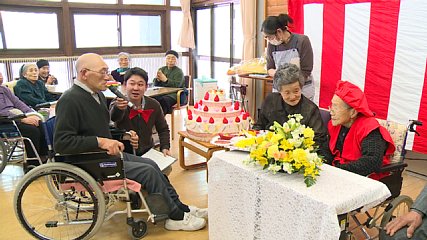 小友町の女性が、きょう(27日・金曜日)100歳の誕生日を迎え、祝う会が開かれました。100歳の誕生日を迎えたのは、小友町で大正4年2月27日に生まれた菊池フクヱさんです。祝う会は、菊池さんが週2回通っているデイサービス「ふれあいホーム小友」で開かれ、利用者や菊池さんの長男夫婦、遠野市社会福祉協議会の臼井悦男会長などが出席しました。菊池フクヱさんは、小友町の菊池亮悦さんと19歳の頃に結婚し、6人の子どもや10人の孫などに恵まれ、農業一筋で生活されてきました。平成9年に夫の亮悦さんに先立たれてからは、孫の世話や家事をこなしながら生活してきたということです。100歳になった今でも食事の自力摂取や会話も可能で、新聞を隅から隅まで読むことが日課だということです。祝う会で、ふれあいホーム小友の糠森俊子所長から「ふれあいホームは20周年になるが、初めてのお祝い事を一緒に祝うことができて心から感謝しています」とあいさつがあった後、社会福祉協議会の臼井会長から「これからも元気で、利用者のお姉さん役として穏やかに過ごしていただきたい」と花束の贈呈がありました。また利用者は、きょうの誕生日会に向けて去年の12月頃から布で作ったイチゴをのせた大きな手作りのバースデーケーキなど準備をしてきました。利用者から手作りのプレゼントが贈られたあと、皆で歌を歌って100歳を祝いました。なお、市内の100歳以上の高齢者は、きょう現在、菊池さんを含めて18人となっています。
