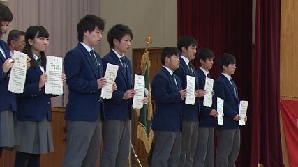 卒業式の後卒業する先輩たちの晴れの門出を祝おうと後輩たちから心温まる贈り物がありました。贈り物とは、ホップの蔓から作られた賞状でした。賞状は、緑峰高校草花研究班の2年生たちが2週間かけて作りました。きょう、卒業した草花研究班の3年生は、ホップの蔓から繊維を取り出して和紙にする工程を確立する研究に取り組み、全国から関心を集めました。2年生は、先輩たちの研究を引き継ぎ、糊空木から天然のりを抽出ししなやかな薄い和紙ができるなど自分たちの研究で見つけた技術を加えながら賞状を作りました。卒業式を前に、きのう(1日・日曜日)3年間の功績などを称える表彰式が行われました。緑峰高校の発展と地域農業の振興に大きく貢献した功績賞が贈られる草花研究班に、後輩たち手作りの賞状が贈られました。後輩たちによるホップ和紙の賞状は、事前に知らされておらず、まさにサプライズでした。後輩たちが作った立派な賞状を手にした卒業生たちは、喜びと後輩たちのこれからの活躍を楽しみに学び舎を巣立ちました。