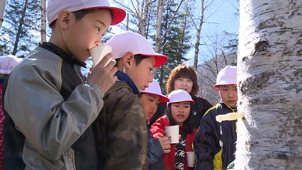 去年、遠野遺産140号に認定された上郷町の旧大峰鉱山跡地で、きのう(15日・水曜日)上郷小学校の児童たちが白樺樹液採取の体験学習を行いました。白樺樹液採取の体験学習をしたのは、上郷小学校の3・4年生の児童およそ30人です。きのうの体験学習は、歴史を学び、地域の特性・恵まれた自然を活用した体験学習をすることで郷土愛を育み、交流を深めてもらおうと、上郷町地域づくり連絡協議会が毎年行っていて、ことしで13回目となります。白樺樹液は、4月10日ごろから4月20日ごろの間の木が芽吹く時に吸い上げた雪解け水でできるため、この時期にしか採取することができないということです。白樺樹液は、無色透明でほのかに甘く、さらっとした飲み心地がして、胃腸痛、食欲不振などに効き目があると言われているということです。児童たちは、穴が開けられた白樺の樹木から採れたての樹液を味わい、木によって樹液の味が違うことを飲み比べて確かめていました。また、児童たちは、牧野農業協同組合などから教えられながら、実際にドリルで樹木に穴を開けたり、木が水を吸い上げる音を聞いたりして、思い思いに楽しんでいる様子でした。白樺樹液を思う存分に味わった後には、更生保護女性の会と牧野協会婦人部の会員による豚汁が振る舞われ、児童たちは自然豊かな場所でおかわりをたくさんしながらおいしそうに食べていました。児童たちは、上郷ならではの春の訪れを、体いっぱいに感じとっていた様子でした。