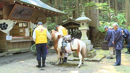 附馬牛町の荒川駒形神社できょう(25日・月曜日)例祭が行われました。荒川駒形神社では、馬や牛の健康や子孫繁栄、豊作などを祈って、旧暦の4月8日に合わせて例祭を行っています。例祭の前には、拝殿前でポニーに乗せた金幣に神を移し、およそ300メートル離れた本宮にあいさつをする本宮参りが行われました。そのあと拝殿で神事が行われ、集まった人たちは、祭壇に玉串を捧げ、大久保正人さんによる尺八の演奏が奉納されるなど、馬や牛の健康を祈願しました。神事のあとには、附馬牛保育園の年長園児が書いた絵馬が奉納されました。また、ポニーや馬のお祓いが行われ、健康を祈っていました。