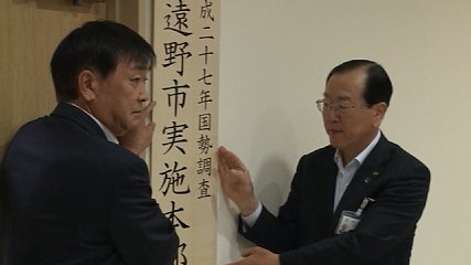 5年に1度の国勢調査が秋に実施されるのを前に、遠野市はきょう(1日・月曜日)、「平成27年国勢調査遠野市実施本部」を設置しました。きょうは、とぴあ庁舎ミーティングルーム前で発足式が行われました。式では、本田市長と、本部長を務める菊池孝二副市長が、入口に看板を掲げました。続いて本田市長が「本部長の指揮のもと確実な調査をお願いします」と訓示しました。国勢調査は、国内に住むすべての人と世帯が対象で、10月1日時点の世帯の人数や就業状態など17項目を調べます。今回の調査からは、パソコンやスマートフォンで回答できるオンライン調査が全国一斉に導入されます。そして9月から10月にかけてオンラインまたは紙の調査票で回答していただくということです。市によりますとことし4月末現在の市の人口は、2万8818人となっています。菊池副市長をはじめ経営企画部長などで組織される実施本部では、全世帯から期日内に回答がもらえるよう、市民に協力を呼び掛けていきたいとしています。