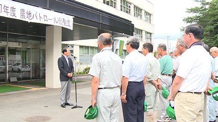 農地パトロール出発式が、先週金曜日(24日)に行われました。「農地パトロール」は、市内の農地の状況を把握し、耕作放棄や無断転用の発生を防ぐことを目的に、遠野市農業委員会がおよそ5年前から行っています。遠野市では、平成22年に「遠野市農林水産振興ビジョン」通称「タフビジョン」を策定し、今年度、最終年度を迎えています。タフビジョンを策定した平成22年当初は、209ヘクタールほどの耕作放棄地がありましたが、菜の花を植える運動など、農業委員の活動の成果が実り、昨年度末には67ヘクタールに減少したということです。その一方で、耕作放棄地の予備軍である不作付け農地が、およそ360ヘクタール見られる現状となっています。出発式には、農業委員26人が出席しました。はじめに本田市長が、「耕作放棄地がゼロになるような皆さんの取り組みが、結果的には遠野の農業を元気にすることにつながります。農地パトロールでは、皆さんの力を存分に発揮していただきたい」と激励しました。そのあと、遠野市農業委員会の山崎登久昭会長が、パトロール宣言をしました。出発式のあと、農業委員のメンバーなどは軽トラック8台に分かれて、合同庁舎から土淵地区センターまでのおよそ7キロを、のぼりを掲げた軽トラックでパレードしました。ことしの農地パトロールは、9月1日(火曜日)から11日(金曜日)までの期間、市内11の地区に分けて、実施される予定となっています。