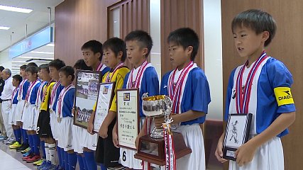 第44回東北地区サッカースポーツ少年団交流大会で準優勝したとして、先週7日(金曜日)ヴァレンテとおのサッカースポーツ少年団が本田市長にその報告をしました。報告に訪れたヴァレンテとおの年団の選手たちは、市職員たちから拍手で迎えられ、本田市長に先月開かれた交流大会で準優勝したことを報告しました。本田市長は、準優勝したことを称えながら、諦めず最後までゴールを目指して、遠野のサッカーを見せてほしいと次の大会に向けて激励していました。先月25日から3日間開催された交流大会には、東北6県から20チームが集まり、このうち岩手県からは、ヴァレンテ遠野を含む最多の5チームが参加し、決勝トーナメントに進出したのはヴァレンテとおのだけということでした。予選リーグを全勝で勝ち上がったヴァレンテ遠野は、決勝戦、宮城県の岩沼西サッカースポーツ少年団と対戦し、1対4と敗れ準優勝となりました。ヴァレンテ遠野は、12月に静岡で行われる全国大会・清水チャンピオン大会に東北代表として参加し、優勝を目指すということです。