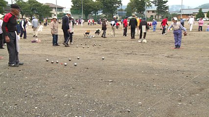 岩手県民長寿体育祭ペタンク交流大会が、おととい(6日・日曜日)、遠野市を会場に開催され、市内外から愛好家が集いました。この大会は、県やいきいき岩手支援財団などが開き、ことしで27回目です。遠野市での普及定着のため去年に続いて遠野東中学校を会場に開かれた大会には、遠野市内24チームを含む、宮古市や北上市などから64チーム192人が出場しました。開会式では、参加者の中で男女それぞれ最高齢の、青笹町の佐々木長吉さん91歳と、おなじく青笹町の佐藤トヨさん84歳が表彰されました。競技は、予選リーグと決勝トーナメントで行われました。ペタンクは、木製の小さい目標球に金属製のボールを投げ、どれだけ自分のチームのボールを多く近づけるかを競うゲームです。来年のいわて国体ではデモンストレーション競技として北上市で競技が行われることになっています。どのチームも、決勝トーナメントに駒を進めようとプレーに集中し、さわやかな汗を流していました。市内外から集まったペタンク愛好家たちは、日ごろの練習の成果を発揮し楽しい時間を過ごしていました。なお試合の結果は、北上市の飯豊Yが優勝しました。