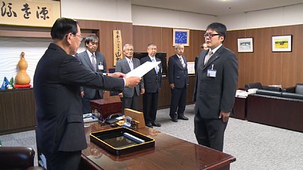 きょう(30日・水曜日)付けで岩手中部広域行政組合に派遣となる市職員への辞令交付が今朝、市長室で行われました。岩手中部クリーンセンターと遠野中継センターの稼働に伴い、きょう付けで岩手中部広域行政組合に派遣されるのは、これまで市環境整備部清養園クリーンセンターの業務に従事していた片倉武さんです。けさ行われた辞令交付で本田市長から片倉さんに派遣辞令書が手渡されました。この後本田市長は、「市民生活の安心安全、安定した生活を営む上で大事な業務であり、広域行政組合の構成員である3市1町の職員とも十分に連携をとって業務にあたってほしい」と訓示しました。きょう辞令を受け取った片倉さんは、綾織町の清養園クリーンセンターに隣接する遠野中継センターで、運営業務に携わることになります。なお、北上市和賀町に整備された岩手中部クリーンセンターは、あす(10月1日・木曜日)稼働開始となりますが、ごみの詰め替え運搬施設である遠野中継センターは、来月(10月)19日から本格稼働することになっています。