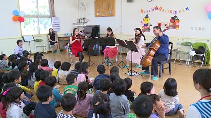 次代を担う子どもたちに演奏家による生の演奏を聞いてもらおうという催しが、おととい(6日・火曜日)白岩保育園で開かれました。この演奏会は、文化庁の文化芸術による子どもの育成事業の中の東日本大震災復興支援として岩手・宮城・福島の3県を中心に園児や児童生徒を対象に開かれているものです。演奏会には、白岩保育園のほか松崎・附馬牛保育園の園児も集まりました。この日、白岩保育園を訪れたのは、ヴァイオリンやビオラ、チェロなど東京を中心に活動する5人の演奏家です。この日の演奏会では、クラッシック音楽や園児たちがよく知るアニメのテーマ音楽が演奏され、楽しい時間を過ごしました。