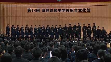 遠野地区中学校総合文化祭が、きのう(5日・木曜日)遠野中学校で行われました。14回目となったきのうの中学校総合文化祭は「遠野から喜びを伝えよう〜みんなで築こう遠野の未来を〜」がテーマです。中学校が統合されてから3年目のことしは、各学校の全校生徒の制服が初めて揃いました。例年では市民センターで開かれていましたが、ことしは改修工事中のため遠野中学校体育館での開催となり、市内3つの中学校の全校生徒など、およそ800人が集まりました。オープニングでは、遠野高校邦楽部による演奏が披露されました。続いて開会式では、生徒を代表して遠野西中学校生徒会長の松田佳一郎君があいさつしました。続いて、中学校総合文化祭のテーマの部とポスターの部の表彰が行われました。その後の発表では、「わたしの主張」や学校ごとに全校生徒での合唱が披露されました。中学校総合文化祭の模様については、来月5日・土曜日と6日・日曜日の午後3時からと8時から、遠野テレビ11chで放送を予定しています。