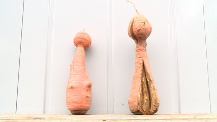 視聴者から「変わったニンジンがとれました」と情報をいただき取材に伺いました。そのニンジンというのがこけしのような形をした2つのニンジン・・・確かに、珍しいですね〜このニンジンを収穫したのは、宮守町下鱒沢に住む平賀敬子さんです。10日ほど前、自宅の畑でこのニンジンを見つけたということです。平賀さんは、およそ50年前から畑仕事をしているということですが、このようなニンジンを見たのは初めてということです。平賀さんは、食べると申し訳ないので大切に飾っておきたいということです。