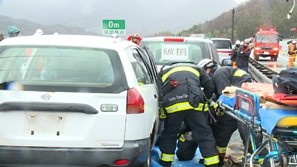 12月5日の開通を前に東北横断自動車道釜石秋田線遠野・宮守間で先週金曜日(27日)、防災訓練が行われました。訓練は、遠野ICから宮守IC間での交通事故発生により、人身事故や車両火災などが発生したことを想定し、防災設備の作動と警察・消防など関係機関が連携し災害を最小限にとどめ二次災害の発生を防止することを目的に実施されました。この日の訓練には、国土交通省や警察、消防県と市の関係機関からおよそ60人が参加しました。この日の訓練は、二郷山(ふたごうやま)トンネル宮守側出入り口付近で、遠野IC方向に進行中の車両が、居眠り運転をしてガードレールに衝突、エンジン部から出火し車両火災が発生したことを想定して行われました。また、同じ方向を進行中の別な車両が事故を避けようと停車したものの、さらに後続の車両が追突する事故が発生し、乗員2人が軽傷、追突した車両に乗っていた運転手が両足を挟まれ脱出ができないということも想定して訓練が行われました。遠野と宮守IC間の中央分離帯の車両防護柵には、おおむね500メートル間隔で緊急開口部(きんきゅうかいこうぶ)が設置されていて、事故が発生した場合などに滞留(たいりゅう)している事故車両を排除したり緊急車両が通る通路として使われるということです。また、今回設置されたキャスター付の人力(じんりき)で移動可能な緊急開口部の防護柵は、全国で初めてということです。雨の中、訓練は終了し、訓練後の講評では、「全体的な流れは良かった」「警察・消防がお互いの安全を確認した上で作業の手順を確認できてよかった」などの声があげられました。国土交通省では、「道路管理者として事故がないように万全の態勢で管理に努めるが、万が一、事故などが起きた場合は協力しながら人命第一で対応したい」とし、「路面が凍結したり積雪がある場合は、気象状況など確認のうえ、気をつけて運転をしてほしい」と呼びかけています。