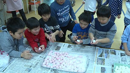 上郷地区センターできょう(6日)恒例の「上郷もちっこフェスティバル」が行われました。この催しは、世代間交流を通して地域の子どもたちに古くから伝わる小正月行事を伝承することや、地域を大切にする心を育むことを目的に開かれています。ことしは、上郷保育園と児童館の子どもたち22人が参加し、地域のお年寄りなどに教わりながら、餅つきや、みづき団子づくりなどの小正月行事を体験しました。みずきに飾る団子は赤や黄色などに色づけして丁寧に丸め、玄関前に用意されたみずきに、縁起もののタイや大黒様のお飾りと一緒に飾りつけていました。続いて、隣の農村公園に移動すると、サイコロ状に刻んだ餅を蒔いてカラスを呼び、稲の作柄を占う「カラスよばり」や、松の枝を稲の苗に見立てて豊作を祈る、「お田植え」を体験しました。いつもの年であれば一面雪で覆われている農村公園も今年は雪が無く、かろうじて雪が残っている場所での「お田植え」となりました。また、体育館ではこま回しや羽根つき、かるたなどといった懐かしい遊びをしながら地域のお年寄りや子どもたちが一緒になって楽しい時間を過ごしました。なお、きょう、飾りつけたみずきは、今月20日ごろまで上郷地区センターの玄関に飾られるということです。