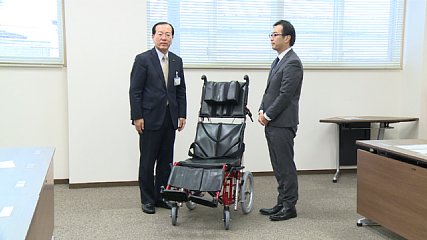 釜石地区法人会青年部会がきのう(18日・月曜日)、遠野市に車いす1台を贈りました。とぴあ庁舎には、釜石地区法人会の角田直樹青年部会長や役員などが訪れ、福祉施設等で役立ててほしいと背もたれを後ろに傾けられるリクライニング式の車いす1台を贈りました。釜石税務署管内の釜石・大槌・遠野の事業所で構成する釜石地区法人会は、車いすや歩行補助器などを市に贈っているほか、被災地からの転入児童を受け入れている小中学校の教材備品費として、寄付金を贈っています。車いすを受け取った本田市長は、「高齢化社会の中で車いすは使用頻度が高く、必需品です。施設の利用者にとって貴重な車いすとして活用していただけるのでは」と感謝していました。今回贈られた車いすは、宮守町にある介護老人保健施設やまゆりの里で活用されるということで、やまゆりの里の関係者も立会い、リクライニング式の車いすの使い方や座り心地を確認していました。