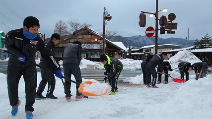 遠野高校サッカー部の部員などが、おととい(26日・火曜日)活動として、除雪作業を行った話題です。遠野高校サッカー部は、先月、全国高校サッカー選手権大会出場にあたり、多くの市民から協力を受けたことへのお礼をしたいと、遠野駅前のロータリーや、とおの物語の館周辺の遊歩道の除雪作業を行いました。この日は、部員たちの思いに賛同した遠野高校サッカー部のOBや遠野かっぱ工事隊も、一緒に汗を流したということです。この日参加したおよそ70人の部員たちは、市民や観光客が快適に歩くことが出来るよう、感謝の気持ちを込めて、除雪作業に一生懸命取り組んだということです。