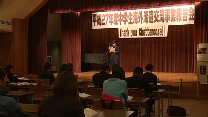 中学生海外派遣交流事業でアメリカのテネシー州チャタヌーガ市を訪問した生徒たちの報告会が、おととい(3日・水曜日)あえりあ遠野で開かれました。17回目となるチャタヌーガ市への訪問は、国際理解・交流への関心を高め、国際化に対応することができる人材の育成を目的に行われ、これまでに、およそ150人の中学生が派遣されています。今回は、市内各中学校から選ばれた中学2年生9人が、先月8日から18日までの日程で、それぞれの研修テーマを持ちながら現地で学校生活やホームステイなどを体験しました。おとといの報告会には、派遣された生徒の親や海外に興味をもっている市内の中学1年生なども集まる中、主催した遠野市教育文化振興財団・角田幸四郎理事長は「関係各位の協力のもと研修を終え、派遣団は全員無事に帰ってきました。今後も事業を通して世界に羽ばたく遠野人の育成に努めて参りたい」とあいさつしていました。このあと、引率した遠野中学校の菅原秋哉先生は、スライドショーで11日間を振り返り、「向こうの生徒たちも話をよく聞いてくれた。人と関わっていくことの大切さを学びました」と報告しました。このあと生徒一人ずつステージに立ち、それぞれの研修テーマについて報告したほか、感想なども発表しました。生徒たちは、発表の終わりに、遠野市教育文化振興財団をはじめとするたくさんの関係者やホストファミリー、体験入学したCSAS校などに感謝の言葉を述べ、成長した姿で、また新たな一歩を踏み出しました。