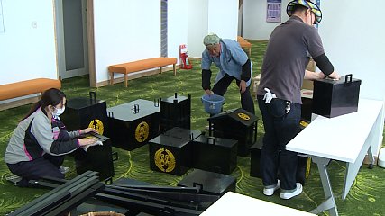 南部氏遠野入部行列がいよいよあす(3日・火曜日)開催されるのを前に、きょう(2日・月曜日)、遠野町地域づくり連絡協議会のメンバーたちが道具の準備などを行いました。今から400年ほど前、遠野へ国替えとなった八戸南部氏22代の直義公が遠野に入部した様子を再現する南部氏遠野入部行列は、ことしで16回目を迎えます。まつりを翌日に控えたきょうは、遠野町地域づくり連絡協議会のメンバーが市民センターに集まり、行列に参加する人たちの刀などの準備を行っていました。メンバーたちは、丁寧に飛脚箱など道具のほこりを落とし、あすに備えていました。行列は、午前11時10分に蔵の道ひろばをスタートし、一日市通りなど市内の目抜き通りを練り歩くことになっています。なお、行列は、市街地での開催となるため交通規制が行われるということです。問い合わせは、市商工観光課までお願いします。