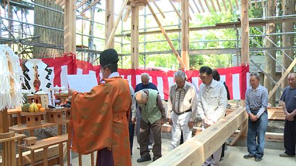 青笹町の八坂神社で、今週日曜日(22日)建物の基礎ができたあと棟木をあげるときに執り行われる上棟式が行われました。八坂神社は、およそ625年前にはたおりが盛んに行われていた頃、京都から職人が移り住み、京都の八坂神社の神霊を移して祀ったのが始まりと言われ、平成21年12月には遠野遺産第83号の認定を受けました。「天王様」と親しまれ先人たちが守り継いできた拝殿は、老朽化に伴い改築されることになり、去年10月から地域の人たちが中心となって拝殿の解体作業と改築工事が行われてきました。今週日曜日の上棟式には、工事関係者や地域の人などおよそ30人が集まり、玉串を捧げるなどして工事の安全と拝殿が無事に完成することを祈願しました。そのあともち振る舞いとなり、地域の子どもたちが一つでも多くもちを拾おうと駆け回っていました。八坂神社は、地域の人たちのコミュニティーの拠点として、また、子どもたちに青笹の歴史や文化を末永く引き継いでいくため、来月の完成を目指して工事が進められることになっています。なお、来月26日には拝殿の落成を祝う拝殿落慶祝賀会が開かれる予定ということです。