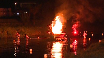 附馬牛町できのう(16日・火曜日)毎年恒例の夏祭りが行われました。会場となった附馬牛地区センターでは、焼き鳥、かき氷などの露店が並び、ビンゴゲームやじゃんけん大会でにぎわいを見せていました。このあと、お盆に迎えた先祖や故人の霊を送り、無病息災を願う送り盆の行事、舟っこ流しが行われました。舟には、初盆を迎えた人たちの位牌やお供え物などが乗せられ、猿ケ石川に向かい出発しました。炎が付けられ燃え上がる舟っこは、男衆たちによって勇ましく引かれていきました。集まった人たちは、舟と灯籠が近づくと静かに見守っていました。