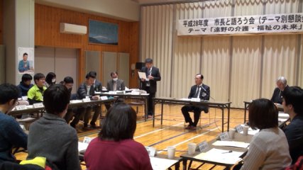 市長と語ろう会がきのう(12日・月曜日)、健康福祉の里で開かれ、市内の医療などに携わる人たちが集まり、懇談が行われました。きのうは、市内の医療・介護・福祉の仕事に従事する若者が集まる「遠野ケアイノベーション会議」の実行委員をはじめ、24人が参加し、「遠野の介護・福祉の未来」をテーマに懇談が行われました。冒頭、遠野ケアイノベーション会議の代表を務める松田学さんから本田市長に先月、あえりあ遠野で開催された「未来介護エクスポ2016」の際、実行委員や市民からこれからの介護・福祉についての希望や課題などの思いが書かれたTシャツが贈られました。懇談では、「まちづくりや地域活性化の観点から『介護・福祉』の分野だけではなく、一般企業と一緒に組むという新しい考え方が必要ではないか」「介護・福祉の担い手不足に対応するために子どもたちへの福祉教育や仕事の魅力を知ってもらう活動も大切」などといった意見・提言があったということです。本田市長は「すぐに改善できるものは、すぐに改善し、その上で、次期計画・遠野市介護保険事業計画通称・ハートフルプランに反映させ、より良い福祉環境をつくっていきたい」と述べ、決意を新たにしたということです。Copyright(C) TonoCableTelevision. All rights reserved.
