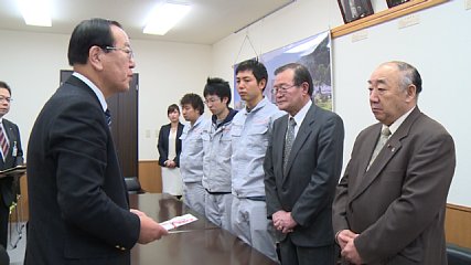 市内の人材育成や研修認定訓練事業などを行う遠野職業訓練協会が先週遠野市に「遠野の活性化に役立ててほしい」と寄付金を贈りました。この日は、職業訓練協会の照井文雄会長などがとぴあ庁舎を訪れ、市に寄付金およそ3万4000円を贈りました。この寄付金は、去年の産業まつりと同時に開催されたとおの技能まつりでの包丁研ぎの収益金を遠野の活性化と発展に使ってほしいと贈られました。受け取った本田市長は、「職業訓練協会は遠野らしさ、ならではを若い世代に活発に伝承している。まさに、人・地域の活性化の役割を担ってもらっている。地域のために使いたい」と、感謝していました。また、この日は去年11月に滝沢市で開催された岩手県若年者技能競技会で、銀賞を受賞した木造建築科2年の部、菊池昌迪さんなどが本田市長に報告し祝福を受けていました。Copyright(C) TonoCableTelevision. All rights reserved.