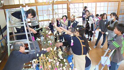 遠野町第三区で先週土曜日(7日)、毎年恒例のミズキ団子作り行事が行われ、地域の三世代が交流を深めました。この行事は、地域の三世代交流を図ろうと、遠野町第三区が子どもたちの冬休みに合わせて毎年開いています。この日は、地域に住む子どもからお年寄りまでおよそ60人が集まり、三世代が肩を並べながらミズキ団子作りを楽しみました。団子が出来上がると、子どもたちが中心となって赤や緑など色とりどりの団子を一つ一つミズキの枝に散りばめるよう上手に飾り付けていきました。このミズキ飾りは、五穀豊穣を祈る小正月の行事として、団子のほかにも、鯛や小判など縁起の良い形をしたものがさまざま飾り付けられました。飾り付けが終わると、華やかなミズキ飾りを前にみんなで写真撮影をして、一足早く小正月の思い出を作っていました。この日は、ミズキ飾りを楽しんでもらおうと、穀町の希望の郷「絆」サポートセンターにも飾り付けられました。また、ミズキ飾りのほかにも、子どもたちがみんなで力を合わせながらもちつきをしたり地域の人が持ち込んだ手作りの道具で遊んだりしました。また、ふるさとに伝わる遊びを子どもたちに伝えようと市内で活動しているグループわらべのメンバーと一緒に、昔遊びも楽しみました。最後は、お雑煮やきなことあんこに包まれたつきたてのもちをみんなで美味しく食べながら、わきあいあいと楽しいひとときを過ごし、三世代交流を深めていました。Copyright(C) TonoCableTelevision. All rights reserved.