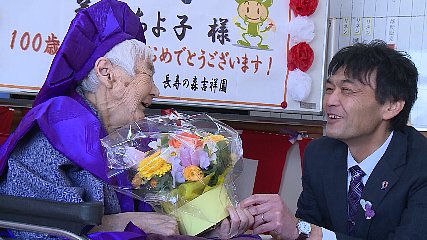 上郷町出身の菊池ちよ子さんが、きょう100歳を迎え、青笹町内の福祉施設で、100歳のお祝い会が開かれました。きょうは、菊池さんが利用している長寿の森吉祥園に飛内雅之副市長もお祝いに訪れました。施設の職員や利用者などが見守る中、100歳の誕生日を迎えた菊池さんに、飛内副市長から、「5回目の成人式をお元気で迎えられ、おめでとうございます。これからもお元気でお過ごしください」とお祝いの記念品と花束が贈られました。この後、利用者の代表や施設長からもプレゼントが贈られ、菊池さんは笑顔で受け取っていました。菊池さんは、大正6年1月26日に青野助次郎さんと志ちよさんの長女として釜石市で生まれました。その後、38歳の時に上郷町平倉の菊池万次郎さんと結婚しました。58歳の時に夫の万次郎さんに先立たれ、20年前から長寿の森吉祥園に入り、利用者自治会の副会長なども努め、施設のイベントの司会など率先して行ったということです。若い時は、踊りや歌を歌うことが趣味という菊池さんは、遠野まつりを見学しに行った際、地元の平倉神楽を見るのを楽しみにしているということです。最後、職員手作りで用意したという飾りつけの中、菊池さんは、集まった関係者と笑顔で記念撮影に収まっていました。なお、遠野市によりますときょう現在、100歳を迎えた人は、菊池さんを含め20人で最高齢は103歳ということです。Copyright(C) TonoCableTelevision. All rights reserved.