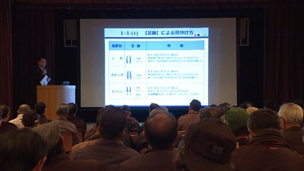 ニホンジカなどの鳥獣による農作物などの被害を減らそうと、鳥獣被害対策研修会がきのう(16日・木曜日)あえりあ遠野で開かれました。遠野市では、ニホンジカをはじめとする野生鳥獣の生息域が拡大し、これまで農作物などの被害が少なかった地域でも被害が増加している状況となっています。市によりますと、平成27年度の遠野市の農作物被害総額は1億1000万円で、ニホンジカによる被害が9割を占めているということです。野生鳥獣の生態を学ぶことで農作物の被害軽減に生かそうと遠野地方有害鳥獣駆除協議会が開いたきのうの研修会には、市内の農家のほか緑峰高校作畜班(さくちくはん)の生徒などおよそ90人が参加しました。研修では初めに、県の中央改良普及センター県域普及グループの佐藤知己さんが、足跡などのフィールドサインによる加害鳥獣の見分け方と生態について参加者たちに説明しました。また、市内でもおととしイノシシが目撃されたことから早めの対策をとろうと、東北野生動物保護管理センターの鈴木淳さんがイノシシの被害対策と捕獲について説明しました。研修会のあとには、ニホンジカ捕獲応援隊の育成講習会が開かれました。ニホンジカ捕獲応援隊は、狩猟(しゅりょう)免許を持たない人でも市が主催する講習会を受講することで、猟友会のメンバーを中心とした遠野市鳥獣被害対策実施隊の指導監視の下、わなの見回りなど補助的な活動ができます。きのう講習を受講した人たちは、実施隊の隊員たちからわなの仕組みや設置方法について学び、応援隊としてことし4月以降から活動することになります。なお、遠野市では、来年度以降もこの講習会を実施する予定ということです。Copyright(C) TonoCableTelevision. All rights reserved.