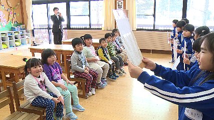 ことし4月から上郷小学校に入学予定の保育園児たちがきのう上郷小学校を訪れました。上郷小学校の一日入学は、新一年生が入学する前に、在学中の児童と交流し少しでも小学校の雰囲気を感じてほしいと行われました。きのう、上郷小学校を訪れたのは、市内の保育園に通う9人の園児です。園児たちは、一年生のお兄さん・お姉さんから「小学校に入ってできるようになったこと」の発表を聞いた後、一年生と手を繋いで校内の各教室を巡ったほか、体育館でこれから習う予定の跳び箱や縄跳びを見学し交流を深めていました。園児たちは、いつもの保育園とこれから入学する小学校の違いを感じながらもワクワクした表情で楽しんでいました。なお、上郷小学校の入学式は4月8日で、全校生徒は79人になる予定です。Copyright(C) TonoCableTelevision. All rights reserved.