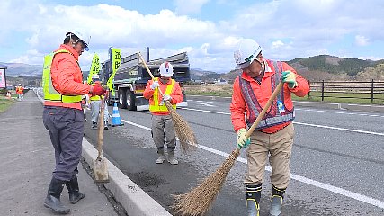 東北横断自動車道釜石秋田線の工事現場周辺道路で、先週土曜日(22日)清掃活動が行われました。国土交通省岩手河川国道事務所では、復興支援道路として「東北横断自動車道釜石秋田線」の平成30年度の全線開通を目指して工事を進めています。工事現場からの土砂運搬にあたっては、各工事現場出口部に泥落とし装置を設置するなど道路を汚さないように努めているということですが、土砂堆積などの汚れが目立つ区間が見受けられることから、この日は、路肩の土砂堆積の撤去やごみ拾いが行われました。清掃活動には、「東北横断自動車道釜石秋田線」の工事施工者16社からおよそ80人が参加しました。初めに、岩手河川国道事務所花巻国道出張所の勝長周悟出張所長が「日頃からお世話になっている道路ですので、感謝の気持ちを込めて清掃活動をしていただきたい」とあいさつしました。そのあと、参加した人たちは4つの班に分かれ、日頃、工事車両が多く通行する国道283号や県道238号など周辺道路およそ11kmの清掃活動に汗を流しました。参加した人たちは、周囲の安全に配慮しながらスコップで車道路肩や歩道に堆積している土砂をけずり、土のう袋に集めていました。清掃された後の道路は、土砂が取り除かれたことで明るさが増し、きらきらと輝いていました。東北横断自動車道釜石秋田線は、平成30年度の全線開通に向けて工事が進められていて、今年度は、道路の舗装をかける前の土の工事を進めるということです。Copyright(C) TonoCableTelevision. All rights reserved.