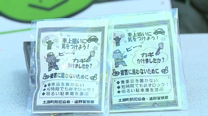 大型連休が始まり、遠野を訪れる観光客などが車上狙いの被害に遭わないようにと、きょう(3日・水曜日)、土淵町の伝承園など駐車場で、車上狙い盗難防止の街頭PR活動が行われました。このPR活動は、駐車中の自動車の中から金品を盗む車上狙いの被害を防止することで、遠野を訪れる観光客などに安心して観光を楽しんでもらおうと、毎年この時期に行われています。晴天に恵まれ観光日和となったきょうは、土淵町防犯協会や遠野警察署などから参加した25人が二手に分かれて車上狙い防止のためのPR活動を行いました。ここ土淵町には、伝承園をはじめカッパ淵やたかむろ水光園など多くの観光名所があり、毎年、たくさんの観光客が訪れます。伝承園の駐車場では、PR活動の参加者が県内外から訪れた観光客やツーリング客などに車上狙い防止のチラシとアメを手渡しながら、注意を呼び掛けていました。遠野警察署によりますと、ことし1月からきのう(2日・火曜日)まで、遠野市内では、車上狙いの被害は発生していないということです。なお、土淵町防犯協会では、地域で犯罪が発生することがないよう今後も積極的に防犯活動を展開していくということです。Copyright(C) TonoCableTelevision. All rights reserved.