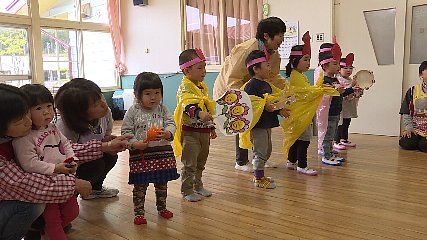 高舘の園の音楽サークルのメンバーたちがきのう(15日・月曜日)鱒沢保育園を訪れ、音楽を通して交流を深めました。きのう、鱒沢保育園を訪れたのは、宮守町下鱒沢にある障がい者支援施設「高舘の園」の音楽サークルのメンバー6人です。園児たちと楽しい時間を過ごせるよう、練習を積み重ねてきたというメンバーたちは、きのう、3曲を披露し、練習の成果を発揮していました。また、音楽サークルのメンバーたちと園児たちが一緒に歌を歌う場面もあり、1歳児から4歳児までの園児8人は、思い思いにダンスをしながら歌を歌い、楽しいひとときを過ごしていました。最後の曲となった「チューリップ」では、園児たちにタンバリンなどの楽器が手渡され、園児たちは、元気よく歌を歌いながら上手に楽器を演奏していました。歌い終わったあと、園児たちからは感謝の気持ちを込めて一生懸命描いた絵が、また、音楽サークルのメンバーたちからは新聞紙で折った「かぶと」がそれぞれプレゼントされ、園児たちは嬉しそうに受け取ると早速かぶとをかぶっていました。最後は、園児たちが「また来てね」と声をかけながら握手やハイタッチでお見送りし、音楽サークルのメンバーたちからは笑顔があふれていました。Copyright(C) TonoCableTelevision. All rights reserved.