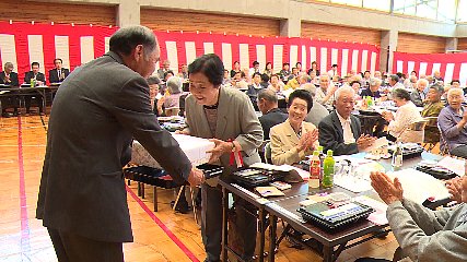 小友町の敬老会が先週24日・土曜日、小友地区センターで開かれました。この日の敬老会には、小友町の敬老対象者350人のうち125人が参加しました。記念品贈呈では、遠野市社会福祉協議会小友支部長から90歳の卒寿9人に茶器セット、本田市長から88歳の米寿15人にタオルセット、77歳の喜寿31人に箸がそれぞれ贈られました。この後、受賞者を代表して菊池榮喜さんが謝辞を述べました。乾杯の後、参加者たちは、近況を報告するなど会話を弾ませていました。また、敬老会には、現在、小友町内で最高齢、鷹鳥屋地区の佐々木タツさん・99歳も会場を訪れ、元気な姿を見せていました。会場では小友の子どもたちによるアトラクションなども行われ、敬老会に花を添えていました。Copyright(C) TonoCableTelevision. All rights reserved.