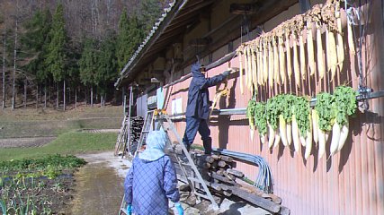 干し大根の話題をお送りします。土淵町内で干し大根を収穫している人たちに会いました。土淵町一ノ渡地区に住む一ノ渡雅保さん・琴子さん夫妻です。先月15日ごろに100本以上干し始めたという大根、1カ月ほどして収穫となりました。この後、早速漬物にしてお正月ごろ友人にプレゼントするということです。